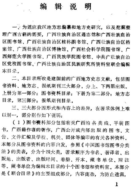 《广西地方史志文献联合目录》(1988版,上下册)是一部大型的、综合性的地方文献检索工具书,由广西通志馆和广西壮族自治区图书馆联合编纂出版。